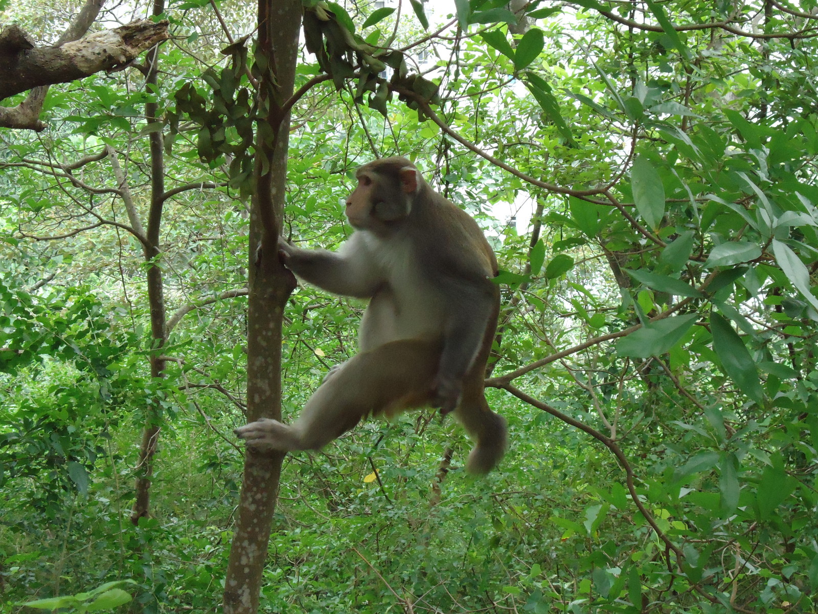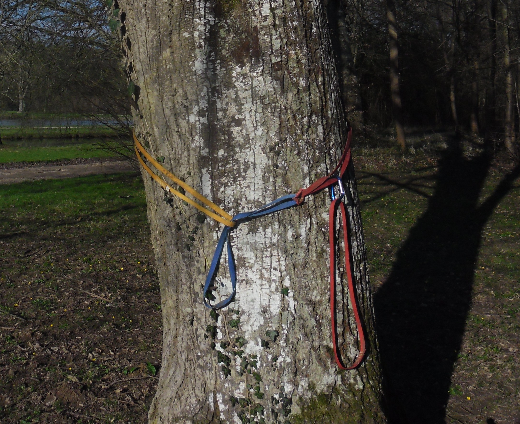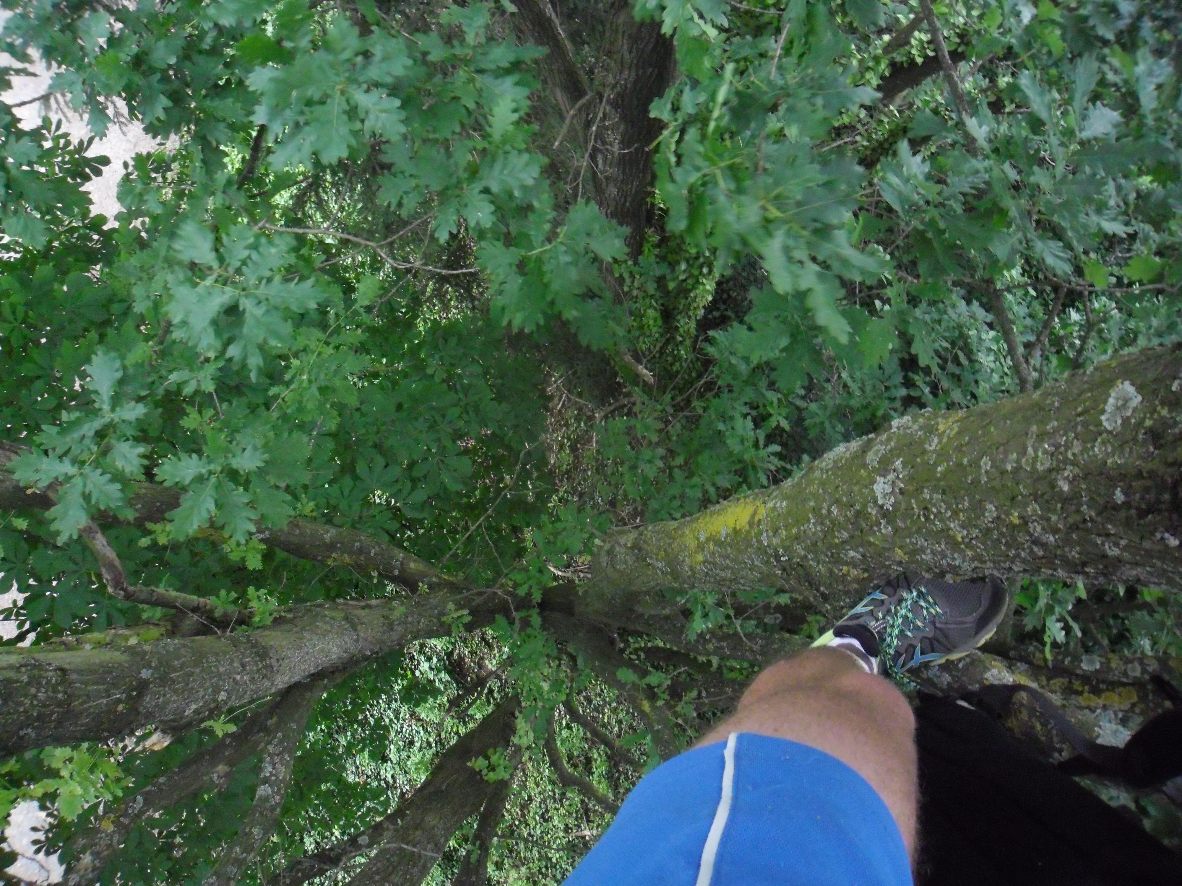 • Sur un peuplier. Le départ ardu m’avait déjà pris 20 minutes, et je me retrouvais au milieu de l’arbre dans une longueur où les branches étaient très écartées. Je progressais comme dans un dièdre, les jambes écartées sur deux branches éloignées du tronc. Le risque de glisser était assez élevé.