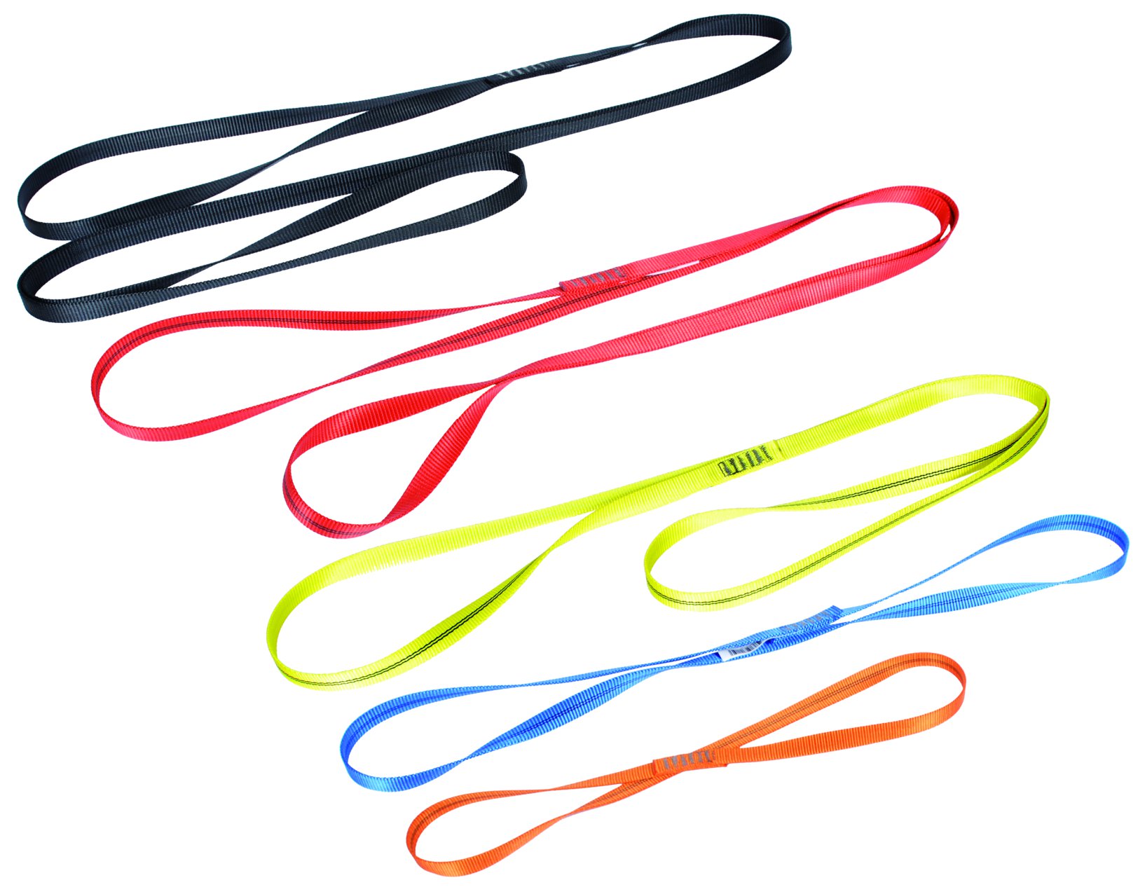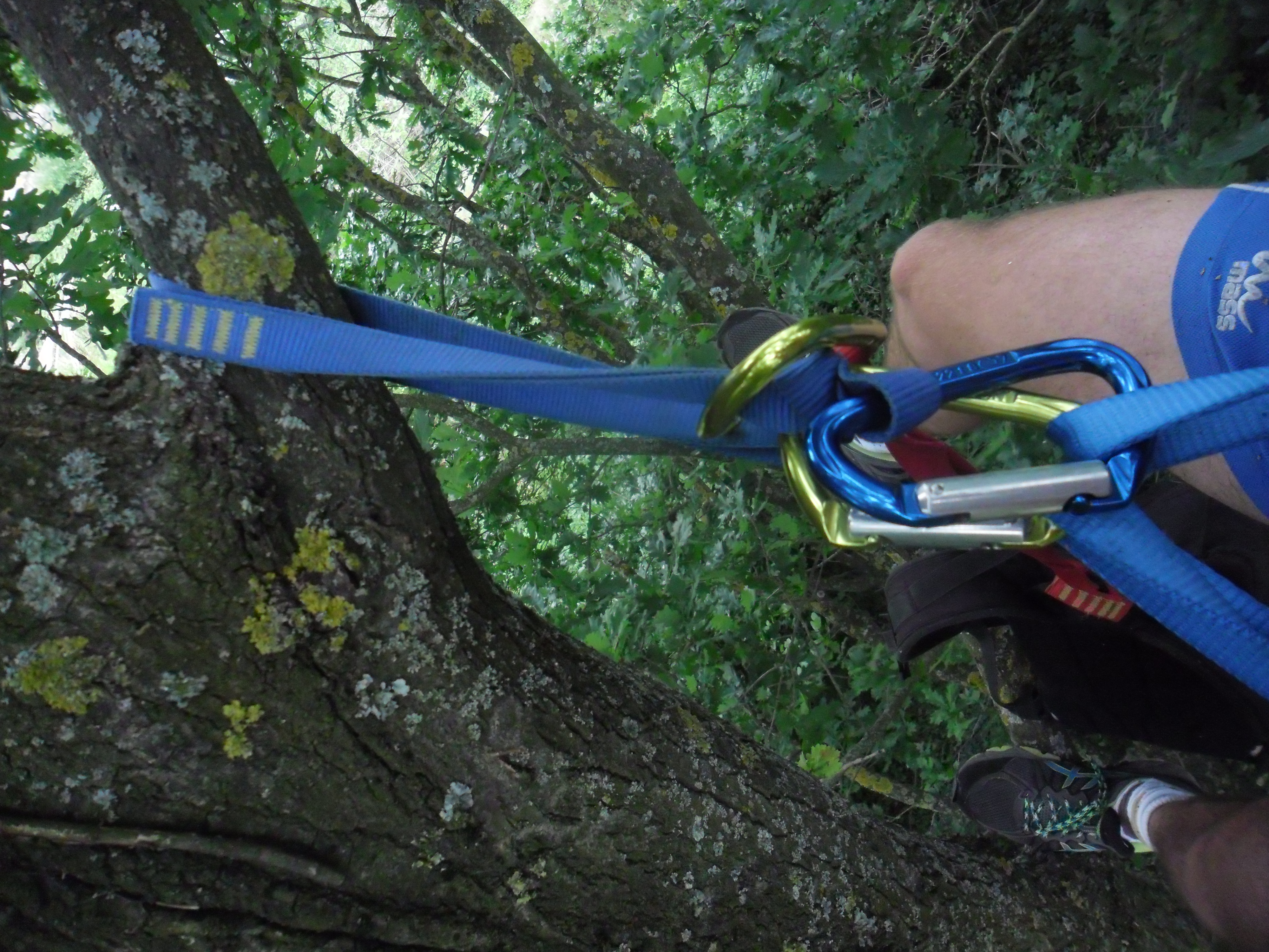 Les sangles sont des anneaux de corde plate. Elles s’enroulent autour des branches et remplacent les étriers. Il en existe de différents longueurs. Les plus courantes sont celles de 60 et 120 cm, et certaines arrivent jusqu’à 180 cm. Les plus grandes seront employées sur les arbres où les branches sont très éloignées. En règle général, pour un arbre moyennement technique, l’emploi de 4 sangles, deux de 60 et deux de 120cm, s’avère suffisant. Cependant, vous remarquerez rapidement que les branches des arbres sont souvent très grosses, et qu’il faut rallonger votre sangle par une seconde. Ainsi, lorsque vous entamez un arbre long ou difficile, emportez une dizaine de sangles. Certaines pourraient rester au départ de l’arbre, une autre peut servir à accrocher votre sac à une branche etc.